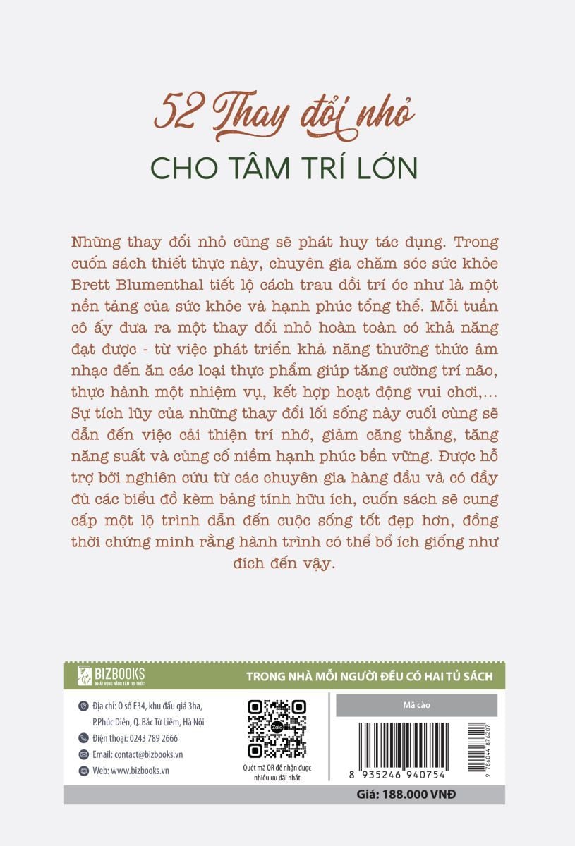 Chuyên gia chăm sóc sức khỏe Brett Blumenthal tiết lộ cách trau dồi trí óc như là một nền tảng của sức khỏe và hạnh phúc tổng thể. Mỗi tuần cô ấy đưa ra một thay đổi nhỏ hoàn toàn có khả năng đạt được - từ việc phát triển khả năng thưởng thức âm nhạc đến ăn các loại thực phẩm giúp tăng cường trí não, thực hành một nhiệm vụ, kết hợp hoạt động vui chơi,... Sự tích lũy của những thay đổi lối sống này cuối cùng sẽ dẫn đến việc cải thiện trí nhớ, giảm căng thẳng, tăng năng suất và cùng cố niềm hạnh phúc bền vững. Được hỗ trợ bởi nghiên cứu từ các chuyên gia hàng đầu và có đầy đủ các biểu đồ kèm bảng tính hữu ích, cuốn sách sẽ cung cấp một lộ trình dẫn đến cuộc sống tốt đẹp hơn, đồng thời chứng minh rằng hành trình có thể bổ ích giống như đích đến vậy.