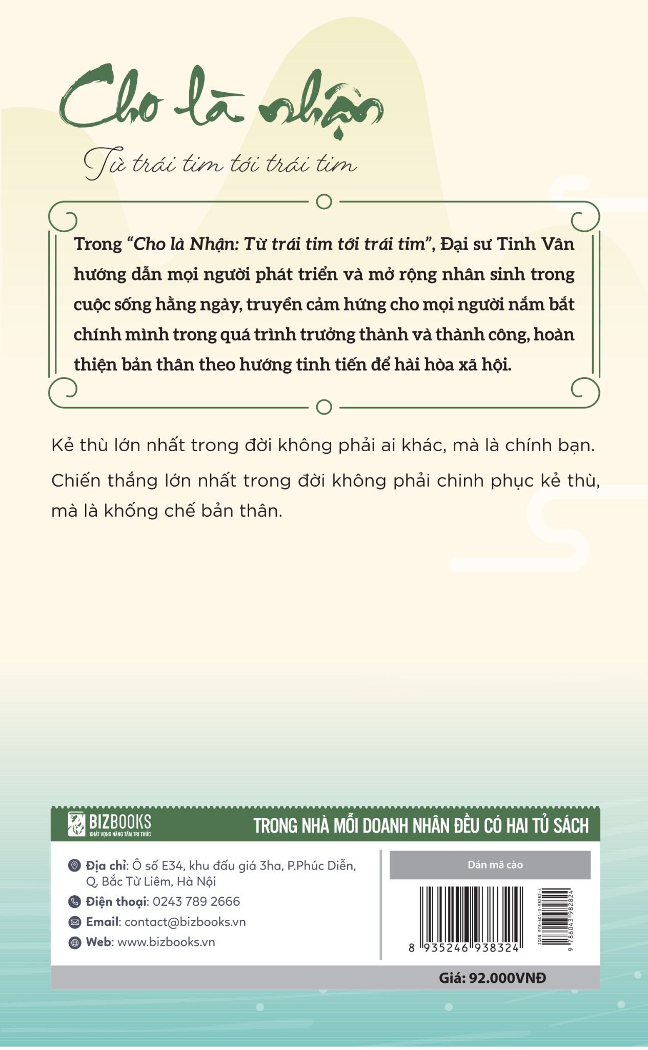 Trong quan hệ giữa con người với nhau, điều quan trọng nhất không phải chia sẻ vinh hoa phú quý hay cùng chung chí hướng tư tưởng, mà là sự thông cảm “từ trái tim đến trái tim”. Cuốn sách Cho là nhận: Từ trái tim tới trái tim sẽ giúp bạn đọc bồi dưỡng bản thân để hiểu mình hiểu đời, xây dựng một trái tim mạnh mẽ, biết yêu thương nhiều hơn và lan toả điều tốt đẹp đến với những đang kề cạnh.