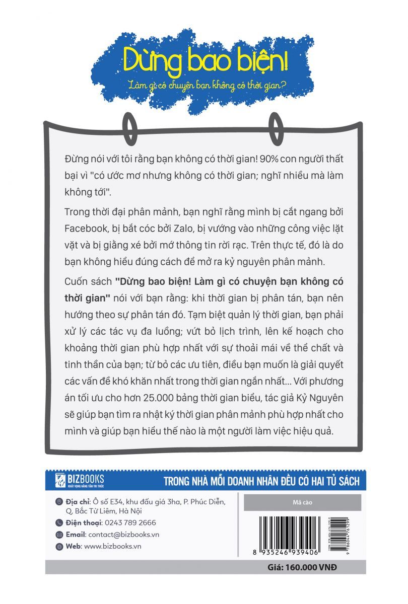 “Không phải người yêu bạn không có thời gian, là họ quan tâm bạn chưa đủ nhiều” cũng giống như bạn: “Không phải bạn không có thời gian, chỉ là bạn biện minh quá nhiều”. Tại sao cùng có 24 giờ như nhau, có người lại hoàn tất mọi công việc, vẫn đủ thảnh thơi. Có người bận rộn cả một ngày vẫn than thở chẳng làm được gì. Nếu bạn đang rơi vào tình trạng trên thì cuốn sách “Dừng bao biện! Làm gì có chuyện bạn không có thời gian” sẽ là cứu tinh cho những cuộc trì hoãn và bao biện. Bao biện là bản chất, nhận ra sự bao biện và vượt qua mới là người thành công.