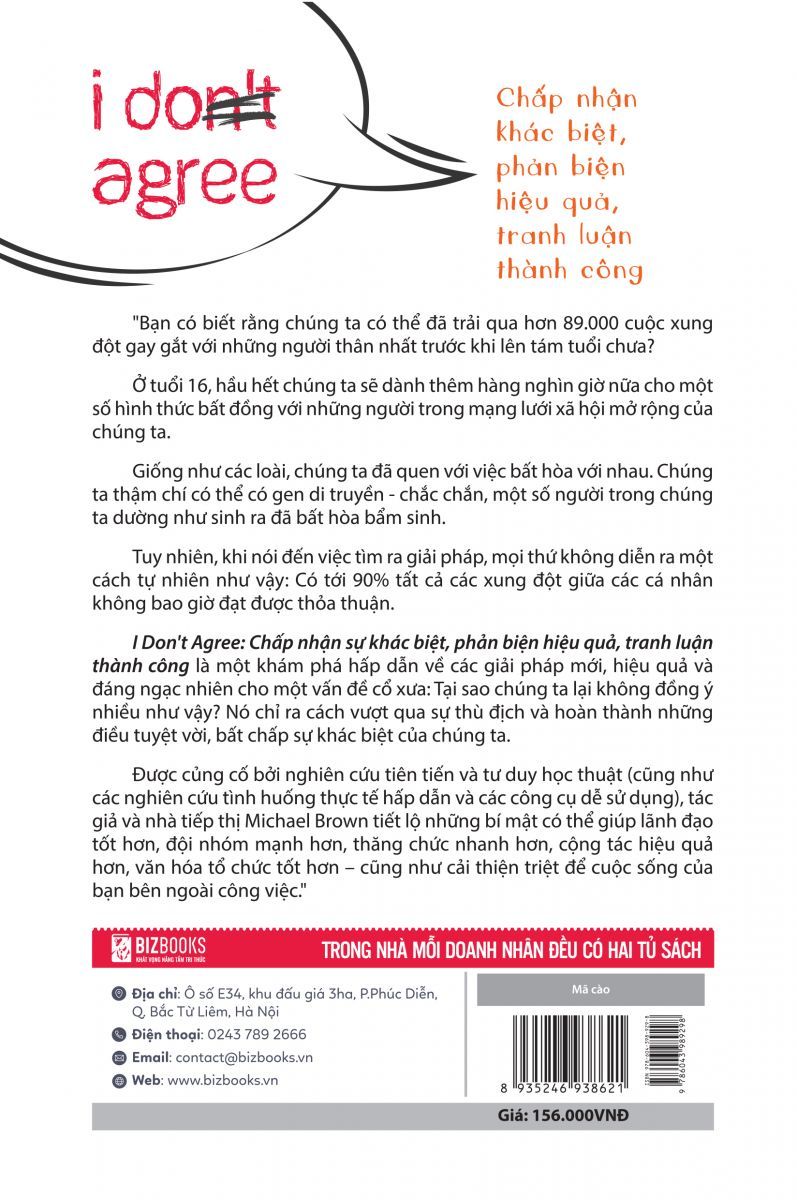 Sẽ thế nào nếu thực sự có một phương thức để người ta khẳng định chắc nịch rằng “Tôi không đồng ý” nhưng cuối cùng vẫn đạt được sự đồng thuận hoàn toàn? Và điều gì sẽ xảy ra nếu hướng tiếp cận xung đột này cũng giúp mọi người xử lý mọi chuyện đâu ra đó, bất chấp tư tưởng đối lập nhau. Và cuốn sách I Don’t Agree: Chấp nhận sự khác biệt, phản biện hiệu quả, tranh luận thành công sẽ cho phép bạn vừa giải quyết vấn đề vừa nhận ra sự khác biệt giữa chúng ta, bất kể tranh cãi về vấn đề gì, bất chấp chủ đề đàm phán ra sao; từ vấn đề bình đẳng đến môi trường, từ việc đề xuất tăng lương đến thăng tiến, từ giới tính đến địa chính trị thông qua 10 bước: