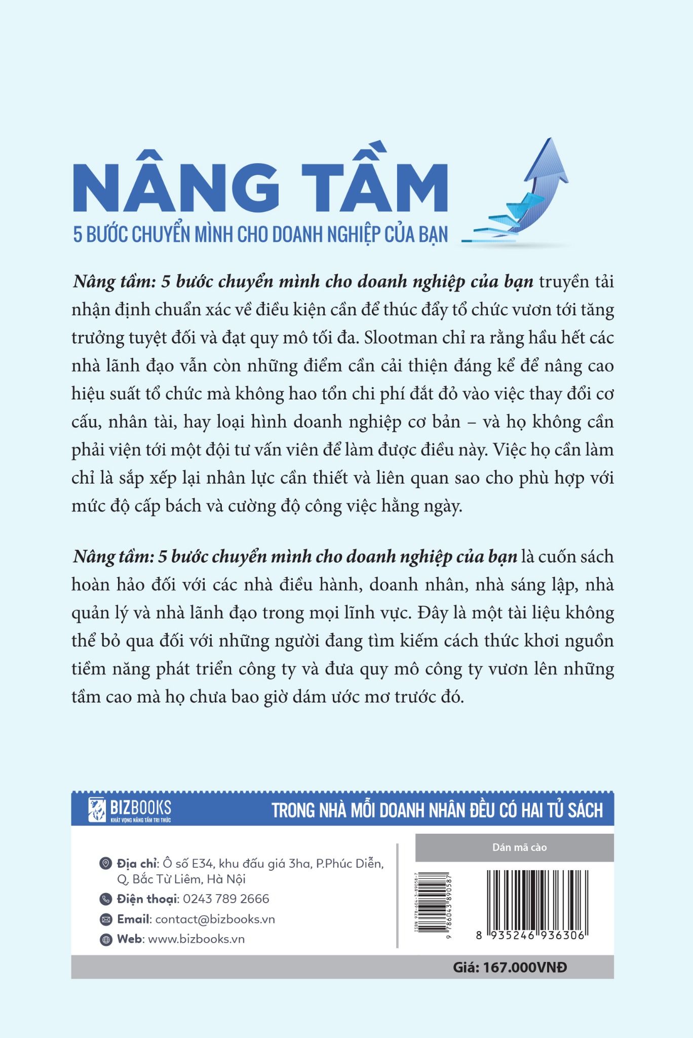 Đây là tài liệu không thể bỏ qua đối với những người đang tìm kiếm cách thức khơi nguồn tiềm năng phát triển công ty và quy mô công ty vươn lên những tầm cao mà họ chưa bao giờ dám ước mơ trước đó. Dù đang lãnh đạo một công ty, một đơn vị kinh doanh hay chỉ một nhóm nhỏ thì cuốn “Nâng tầm - 5 Bước chuyển mình cho doanh nghiệp của bạn” sẽ là công cụ vô giá để định hướng và điều hành tổ chức của bạn cải tiến, đổi mới hoạt động kinh doanh giữa dòng chảy kinh tế hỗn loạn, loại bỏ lãng phí của hệ thống, tập trung vào các quy trình mang lại giá trị gia tăng cho doanh nghiệp. Thách thức lớn nhất của việc nâng tầm doanh nghiệp không nằm ở hệ thống công nghệ hay thiết bị mà nằm chủ yếu ở nhận thức đổi mới tư duy của con người trong tổ chức. Bizbooks chúc bạn những điều tốt đẹp nhất trên hành trình lãnh đạo sắp tới.
