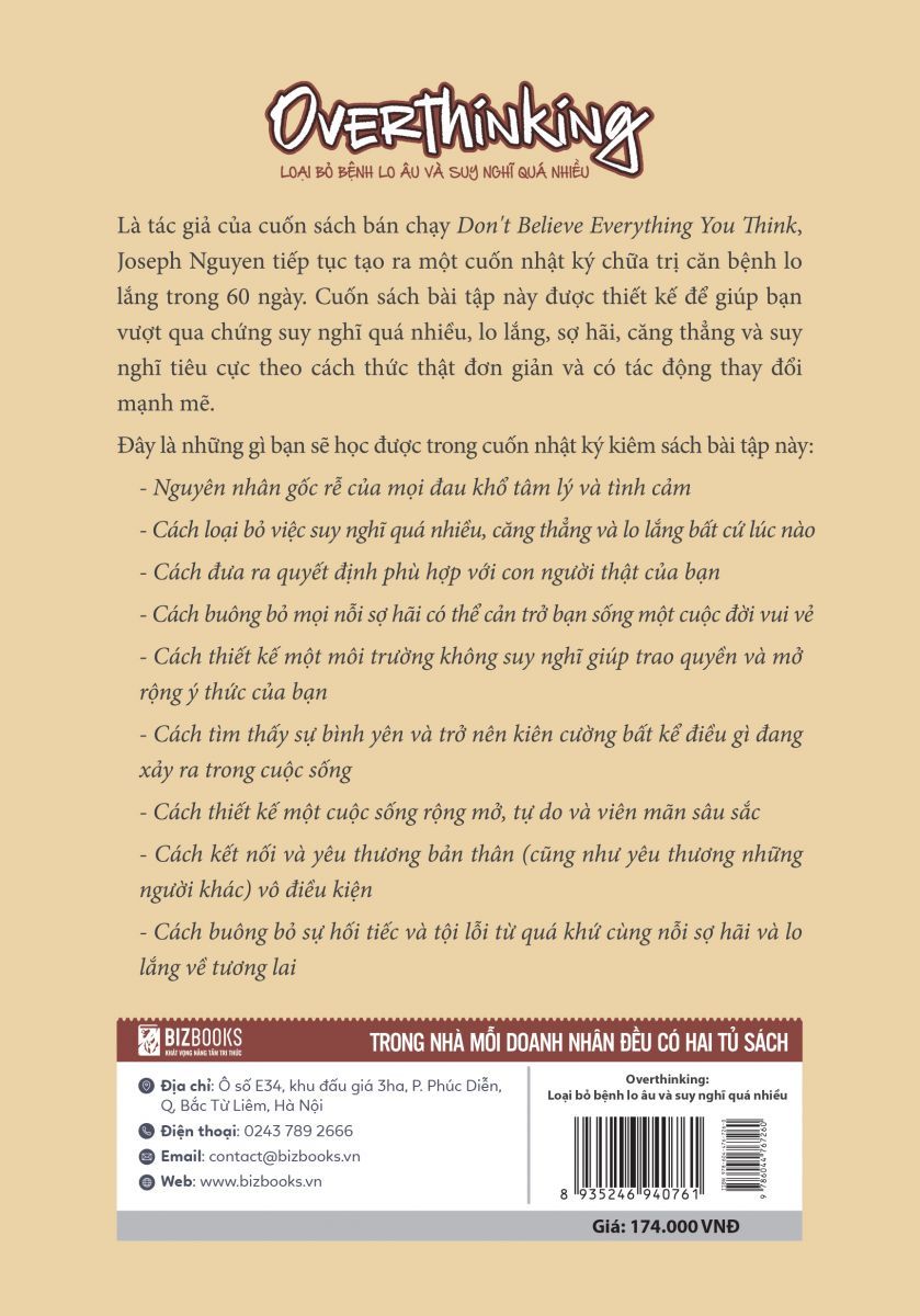 Là tác giả của cuốn sách bán chạy Don’t Believe Everything You Think, Joseph Nguyen tiếp tục tạo ra một cuốn nhật ký chữa trị căn bệnh lo lắng trong 60 ngày với Overthinking - Loại bỏ bệnh lo âu và suy nghĩ quá nhiều.